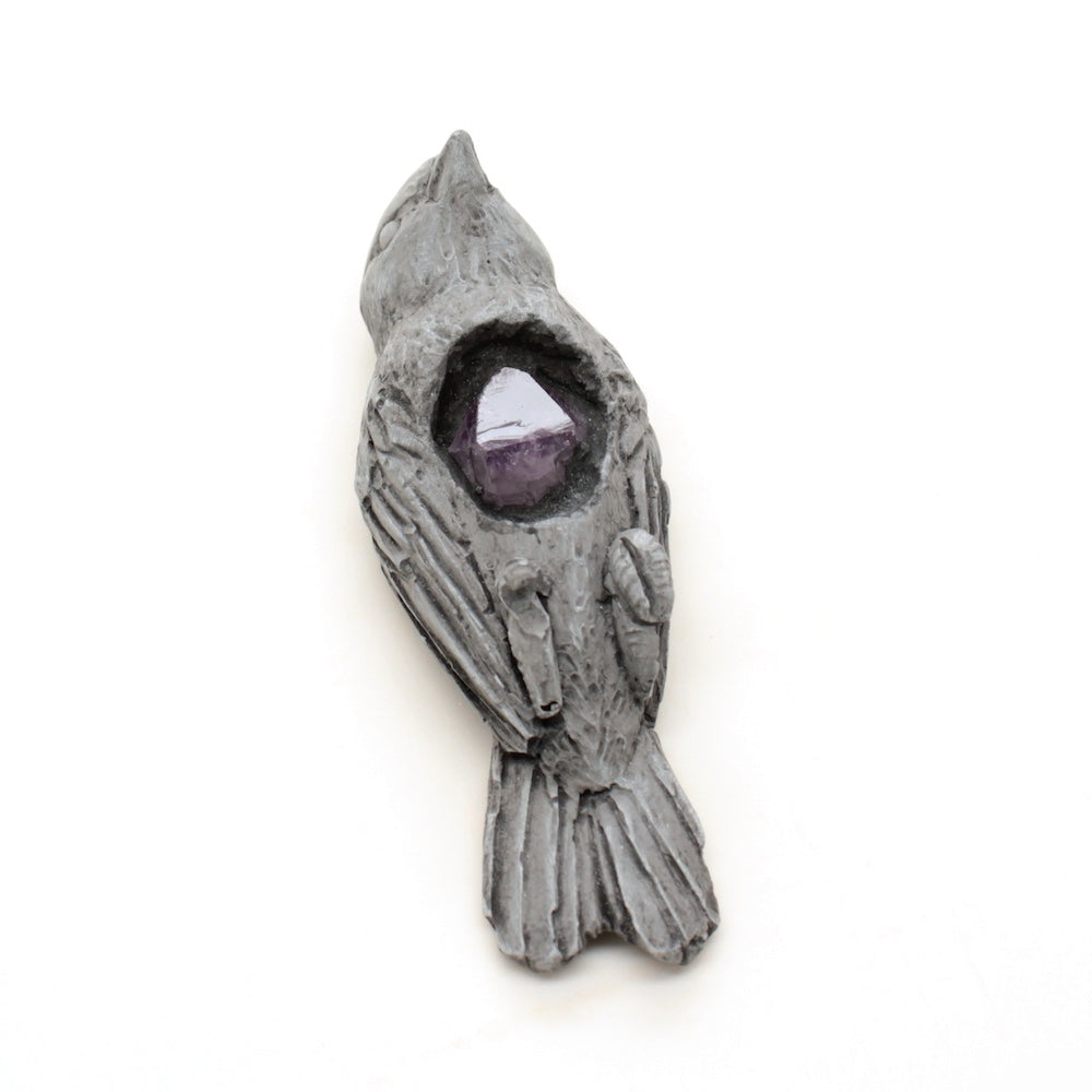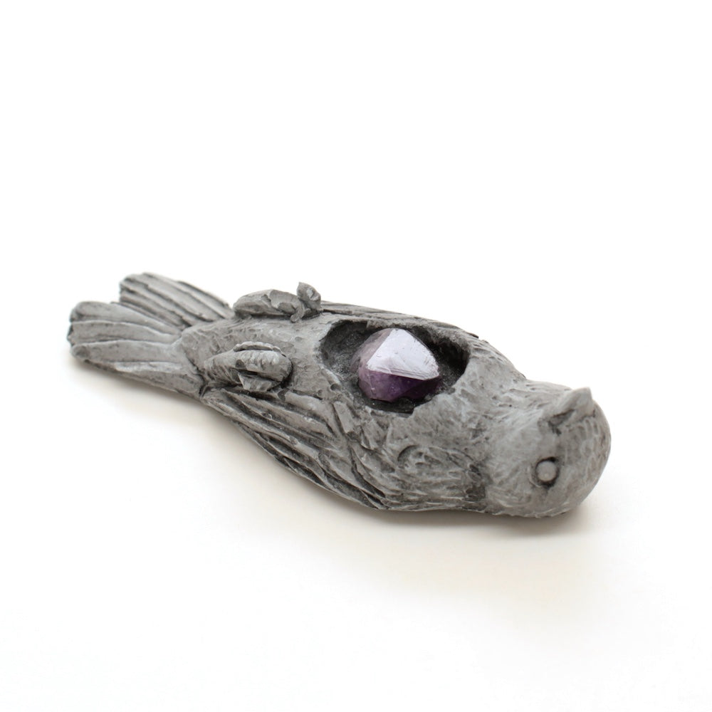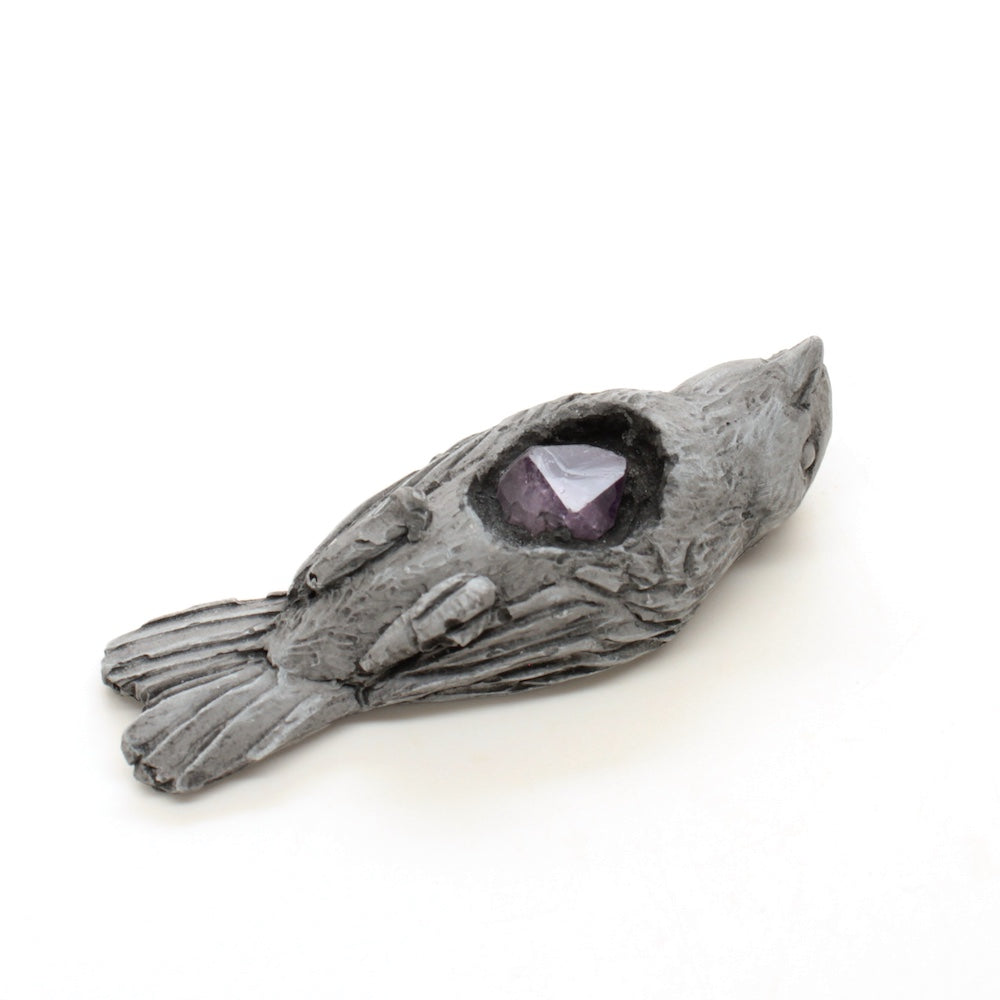 Cast gypsum plaster with an amethyst embedded inside.