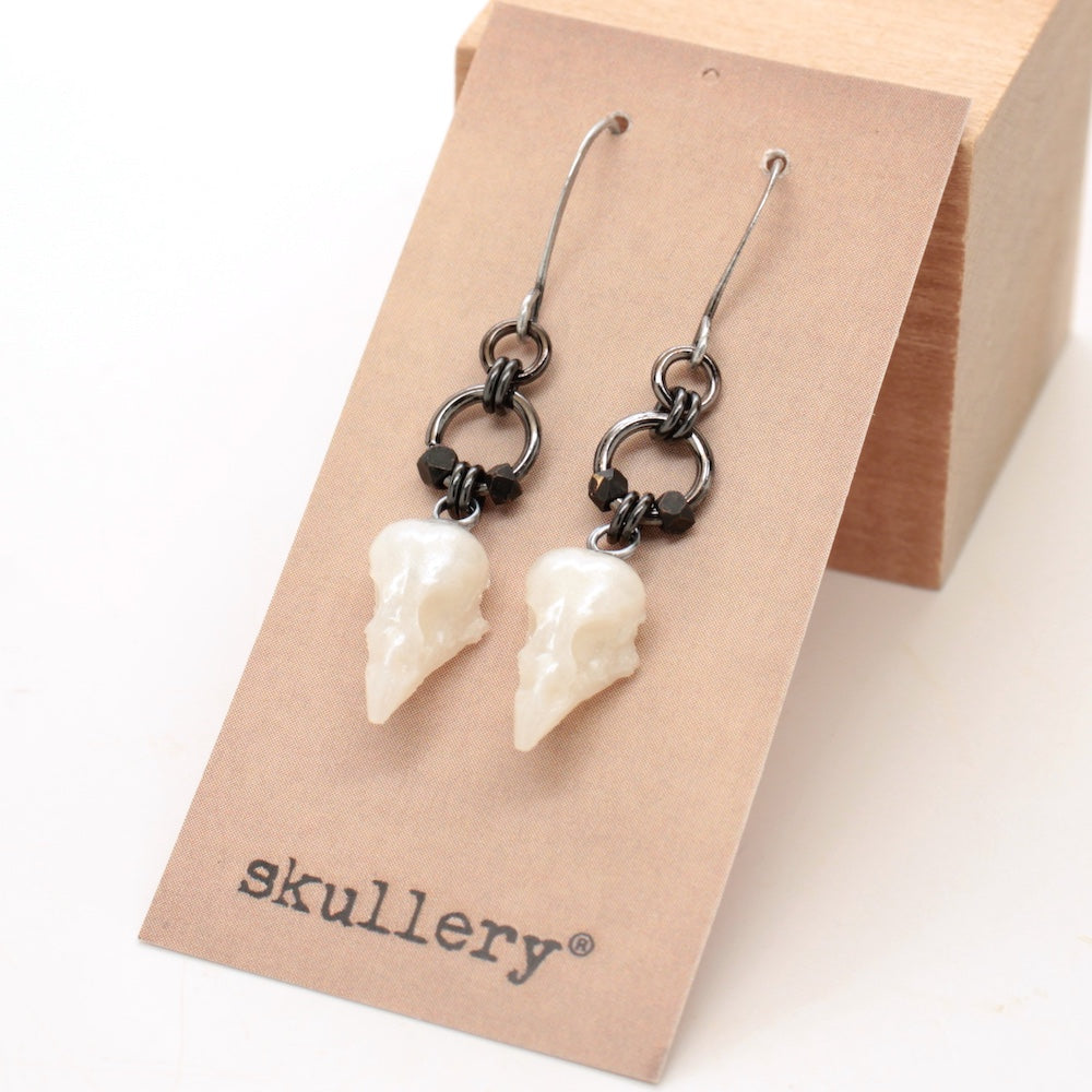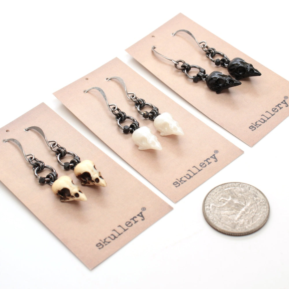 My signature tiny cast resin sparrow skulls on plated brass findings.
