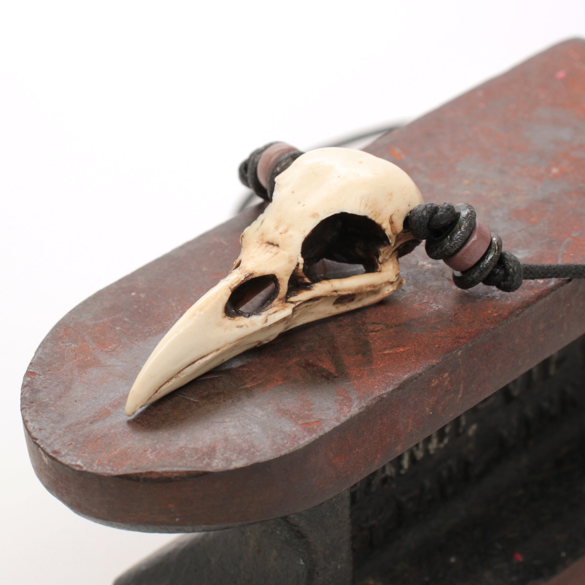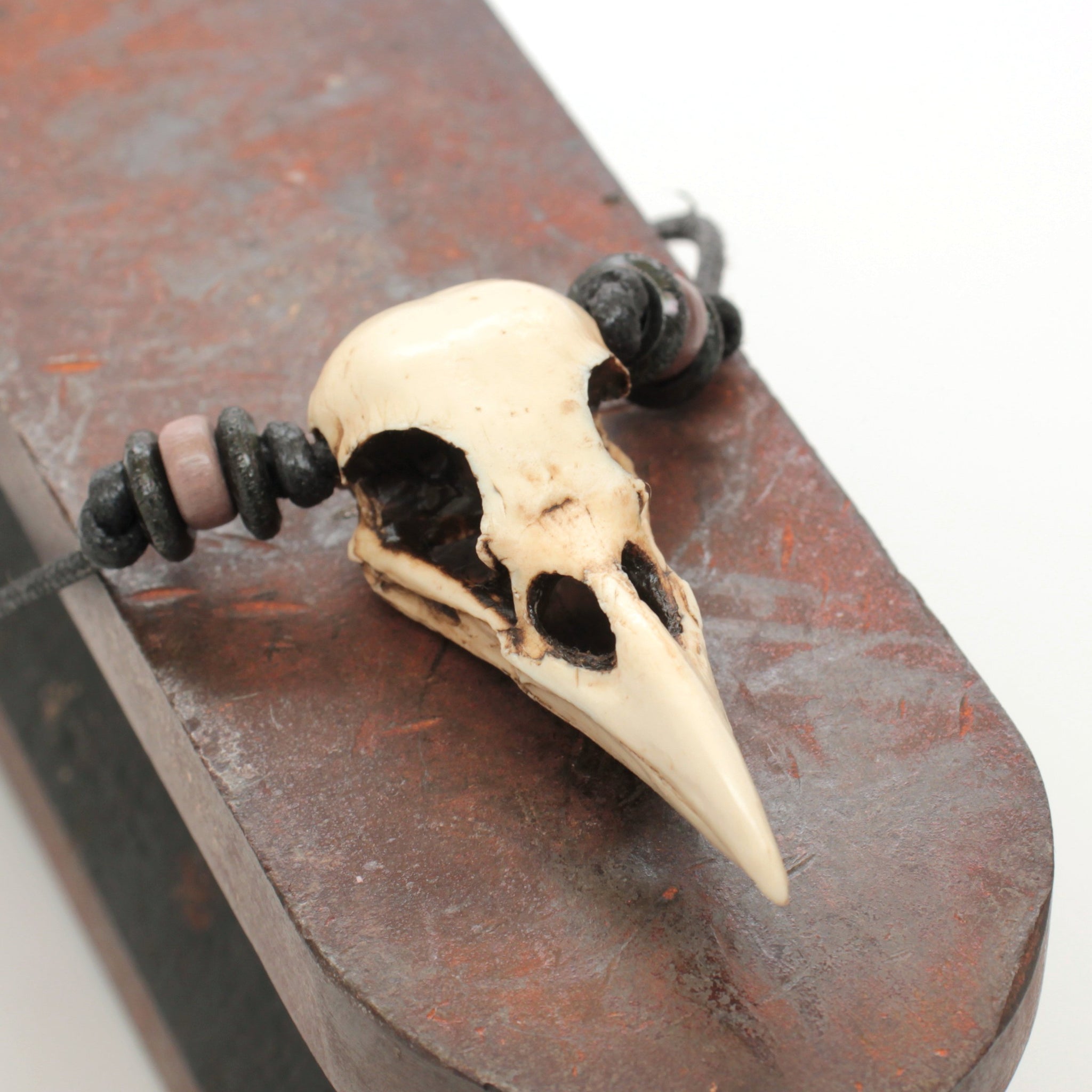 One of my replica miniature crow skulls on an adjustable cotton cord, with brass and wood accent beads.