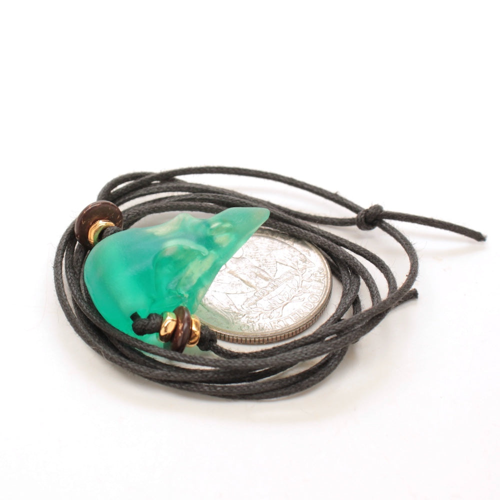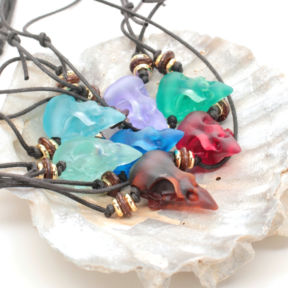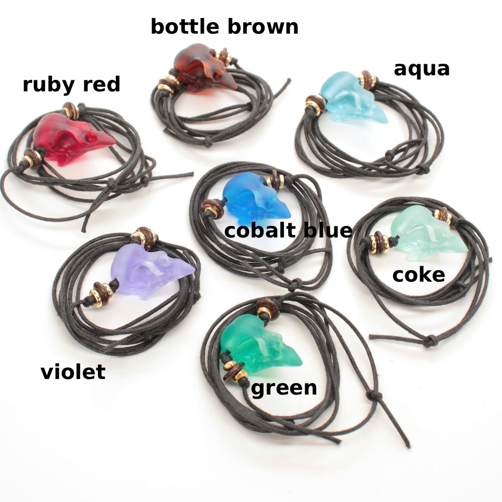 Skulls are cast urethane resin, very durable, on adjustable cotton cords with brass and coconut shell beads.