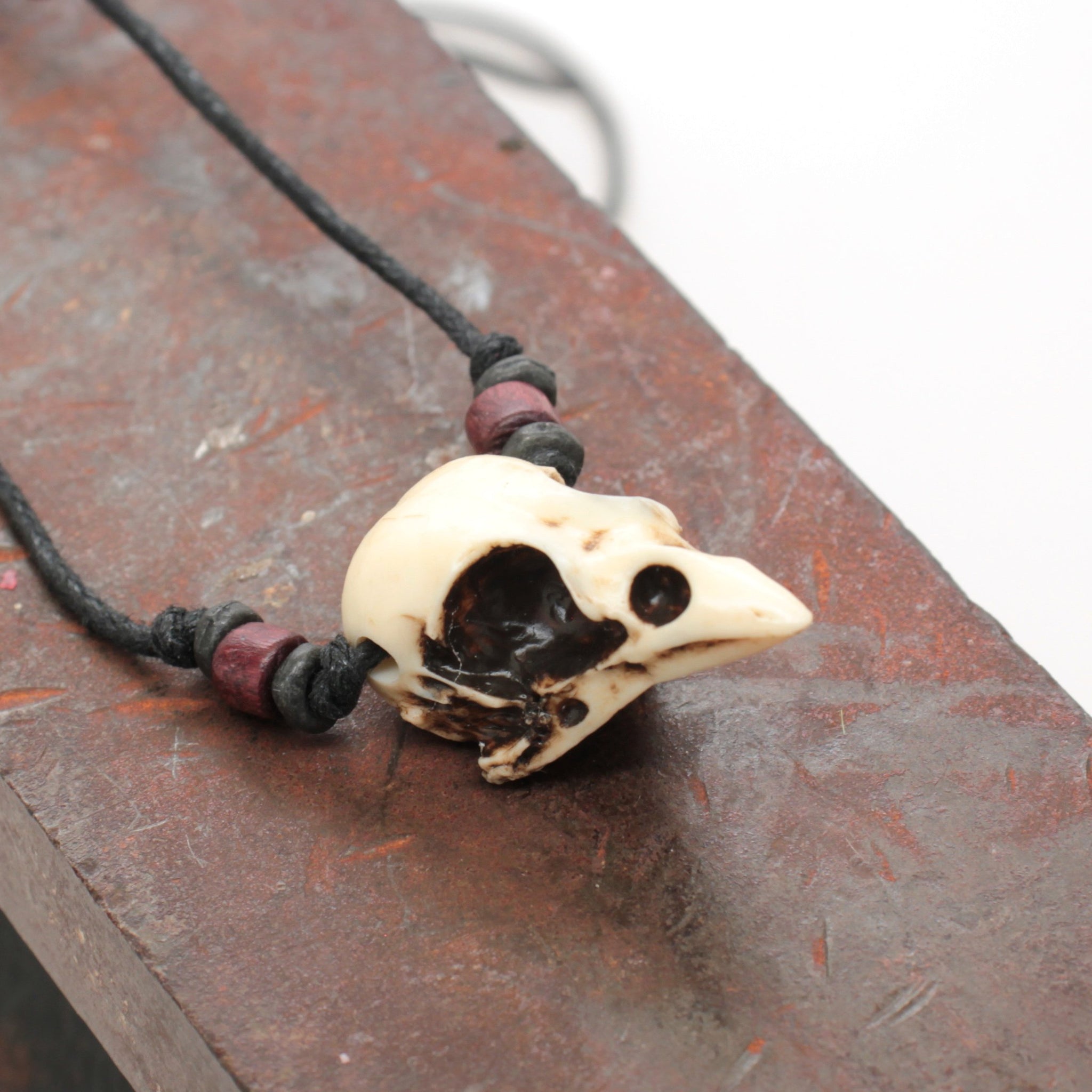 One of my replica sparrow skulls on an adjustable cotton cord, with brass and wood accent beads.