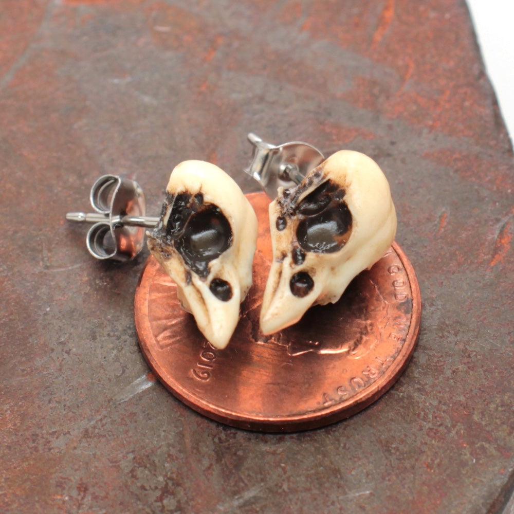 Cast resin miniature sparrow skulls, stained, sealed, attached to stainless steel earring posts.