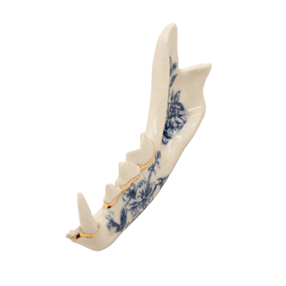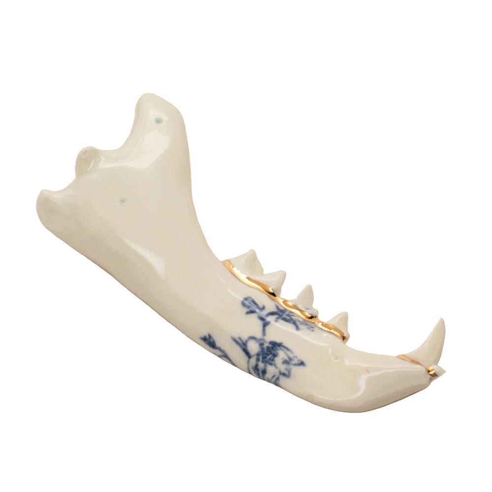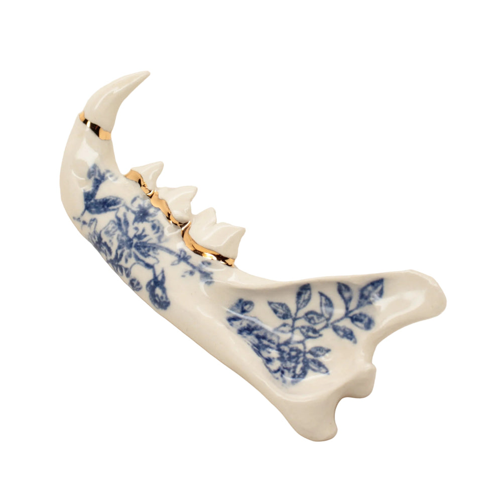 Made from a mold of a real jaw then slipcast in earthenware clay. Blue floral design and an accent of 22k gold luster running along the gumline.