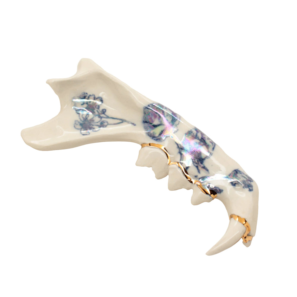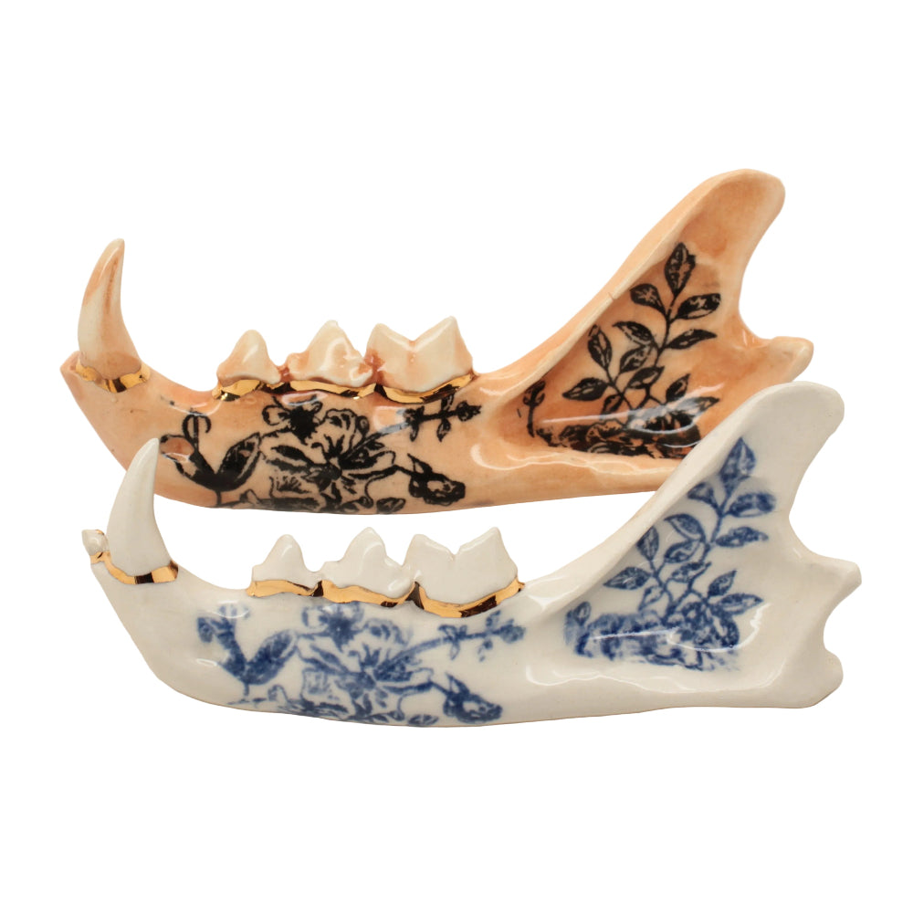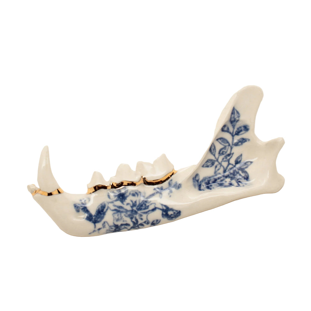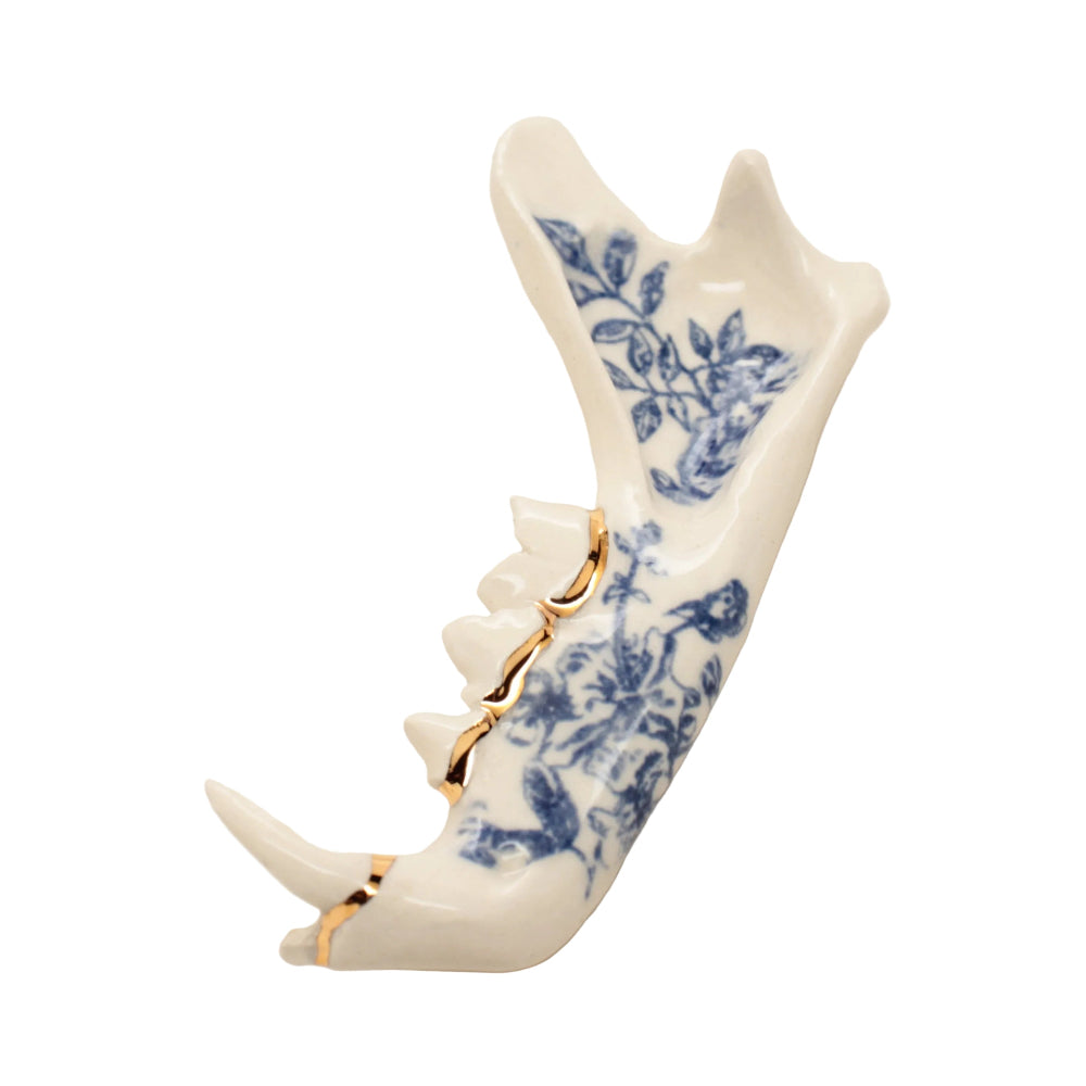 Made from a mold of a real jaw then slipcast in earthenware clay. Blue floral design and an accent of 22k gold luster running along the gumline.