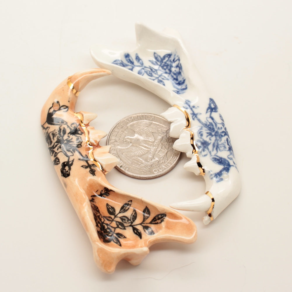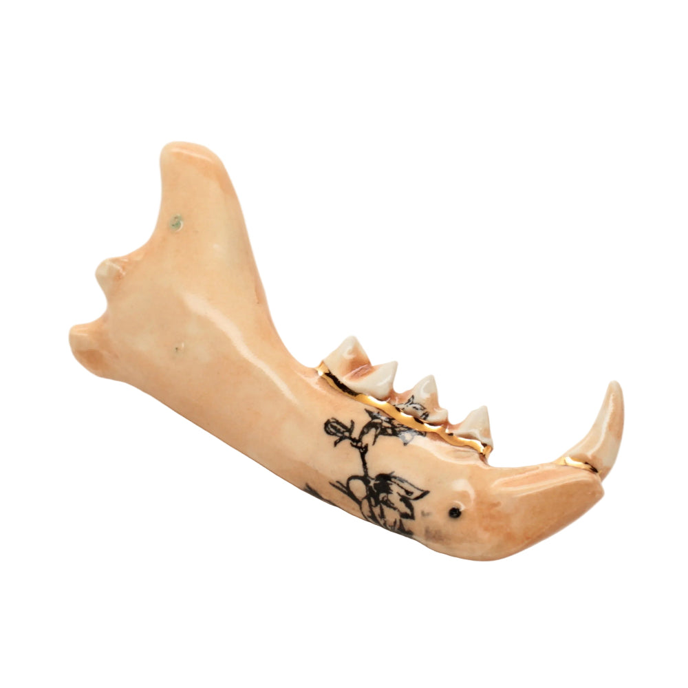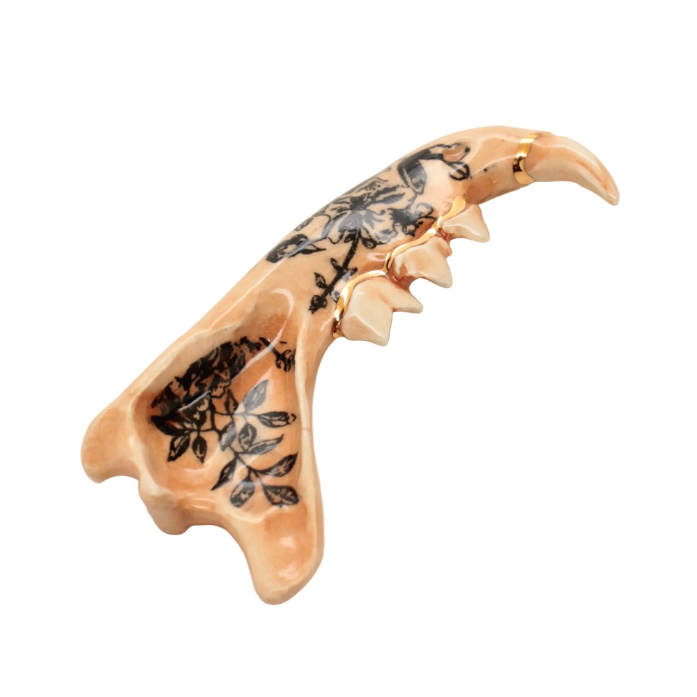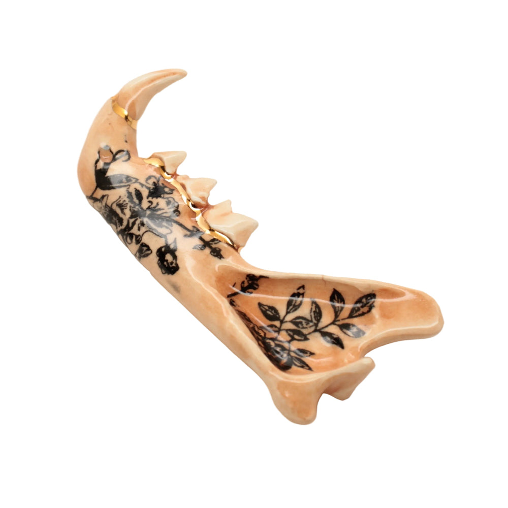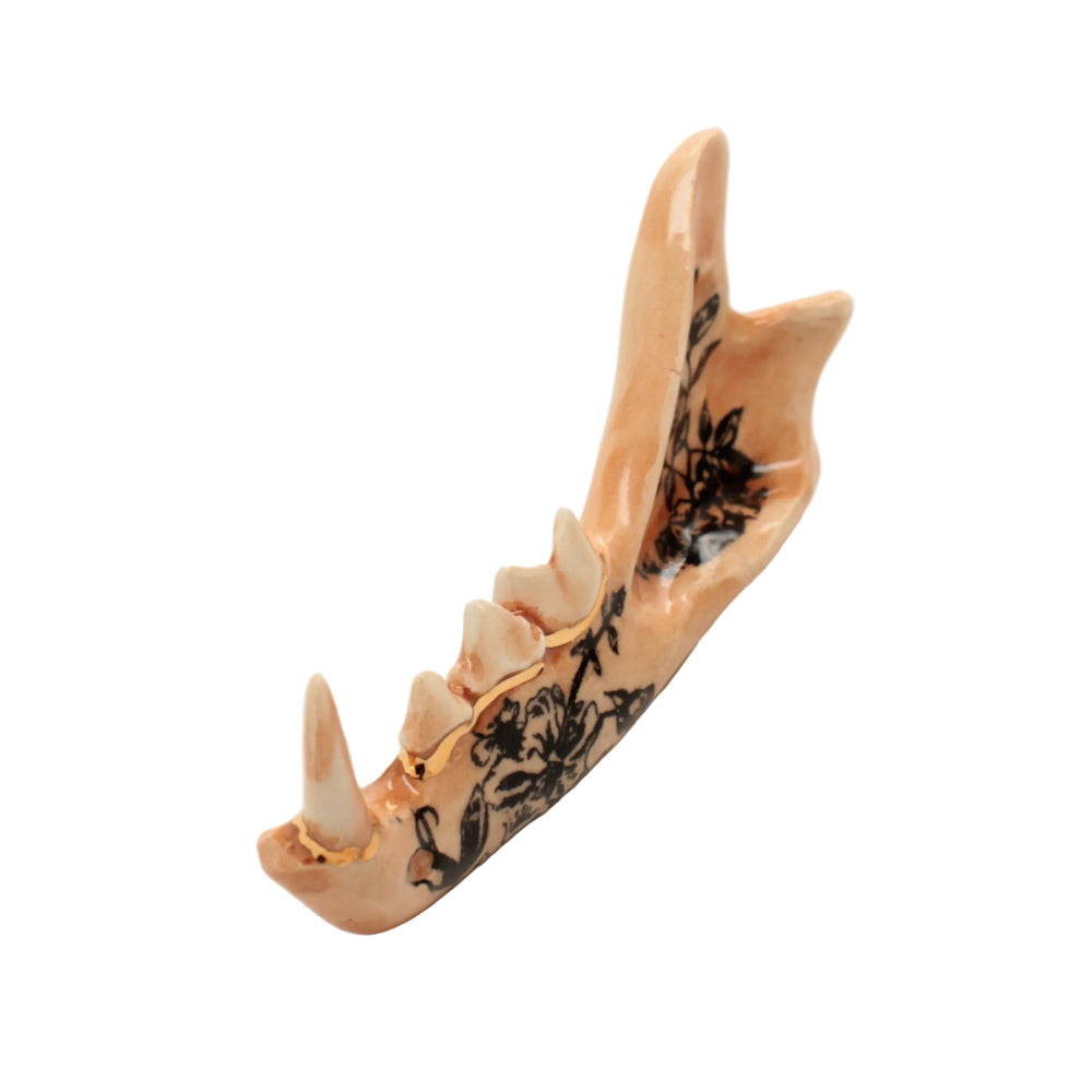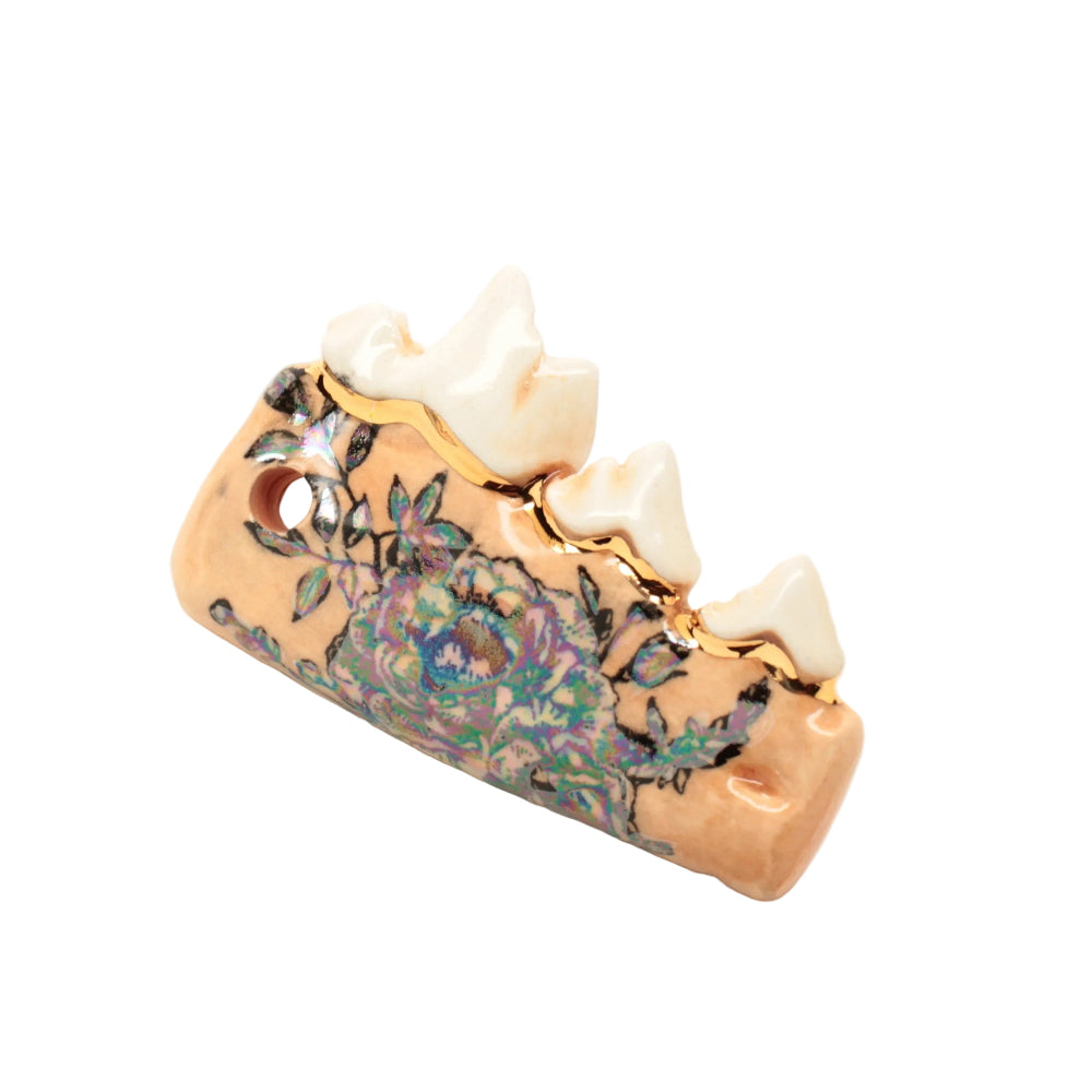 Made from a mold of a real jaw then slipcast in earthenware clay. Black floral design and an accent of 22k gold luster running along the gumline.