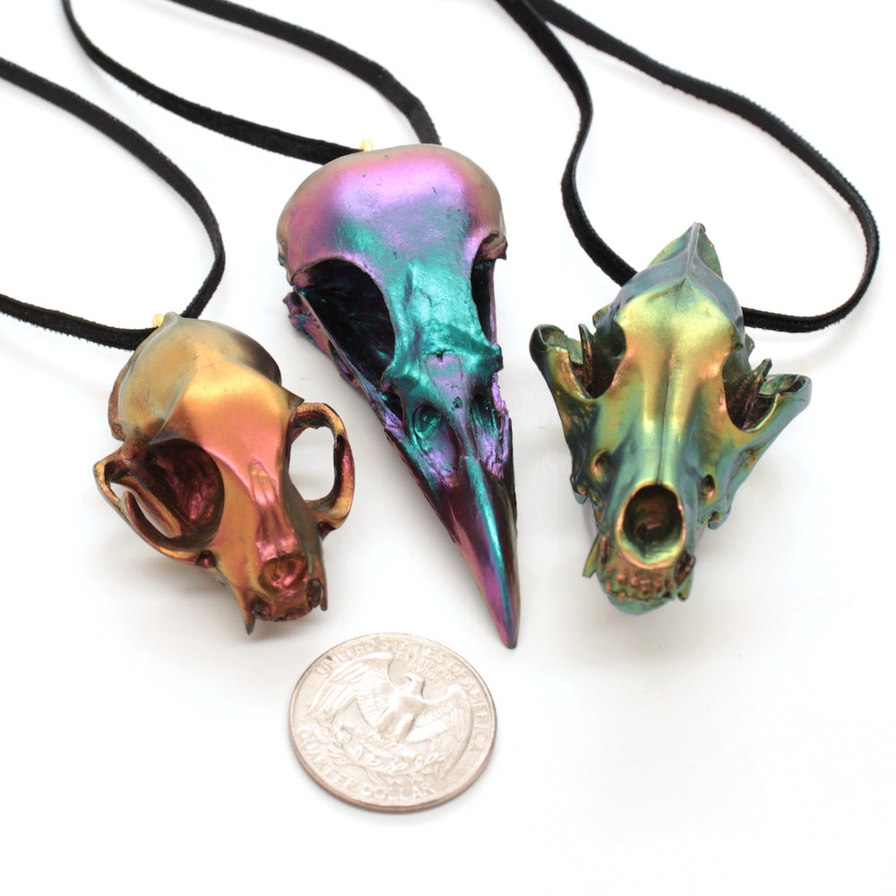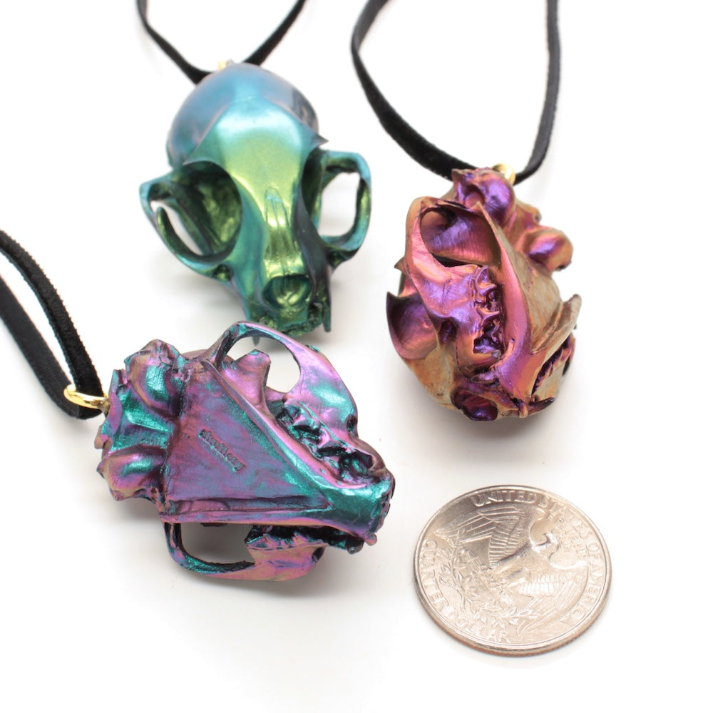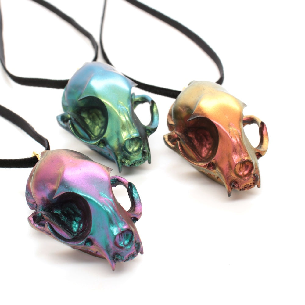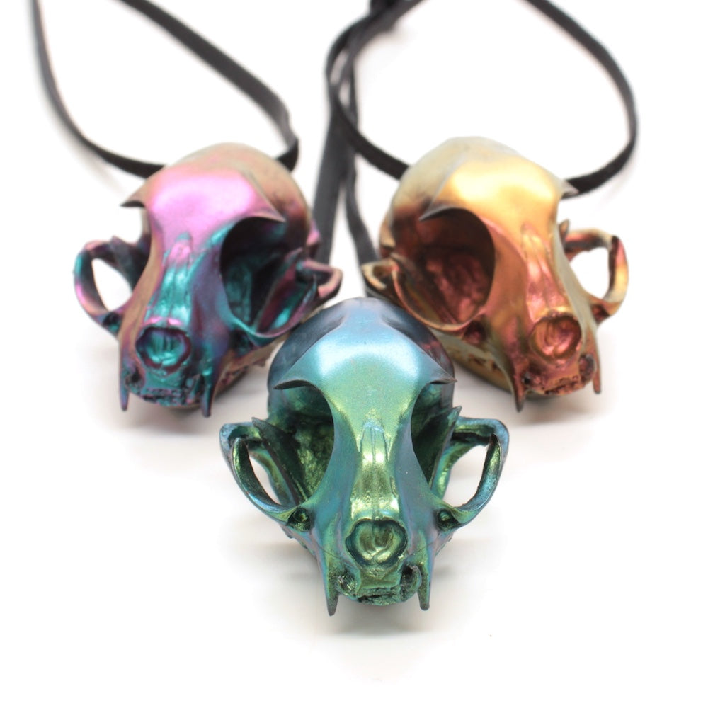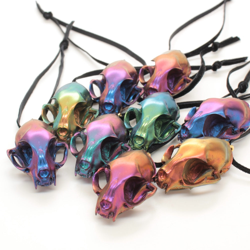 Solid cast resin of my miniature cat skull. Multichrome pigment has brushed in the mold before casting, fusing it to the surface.