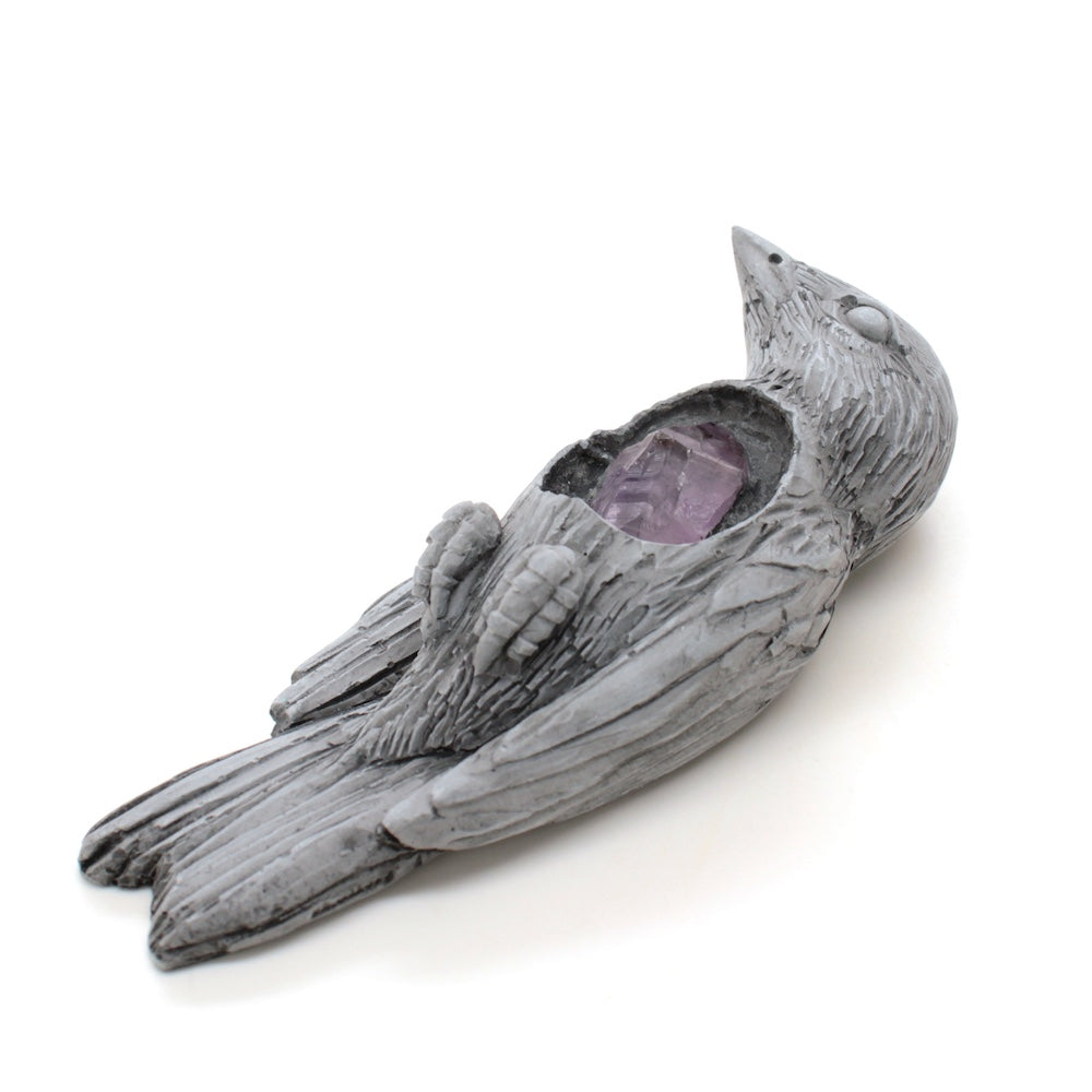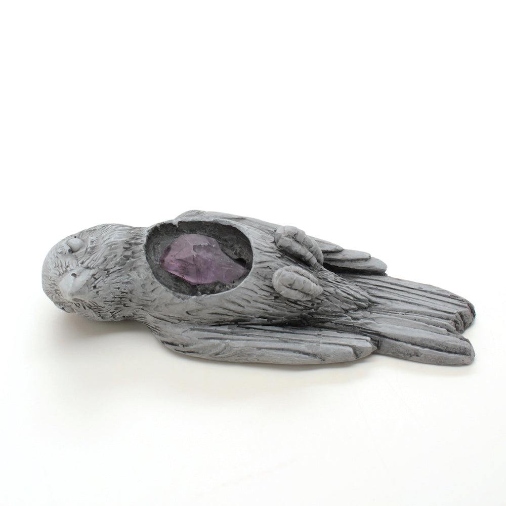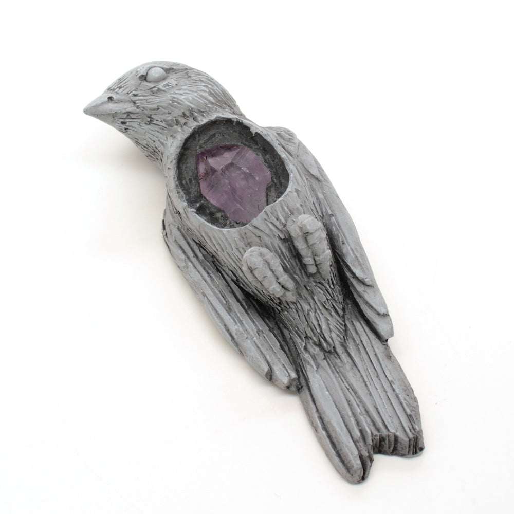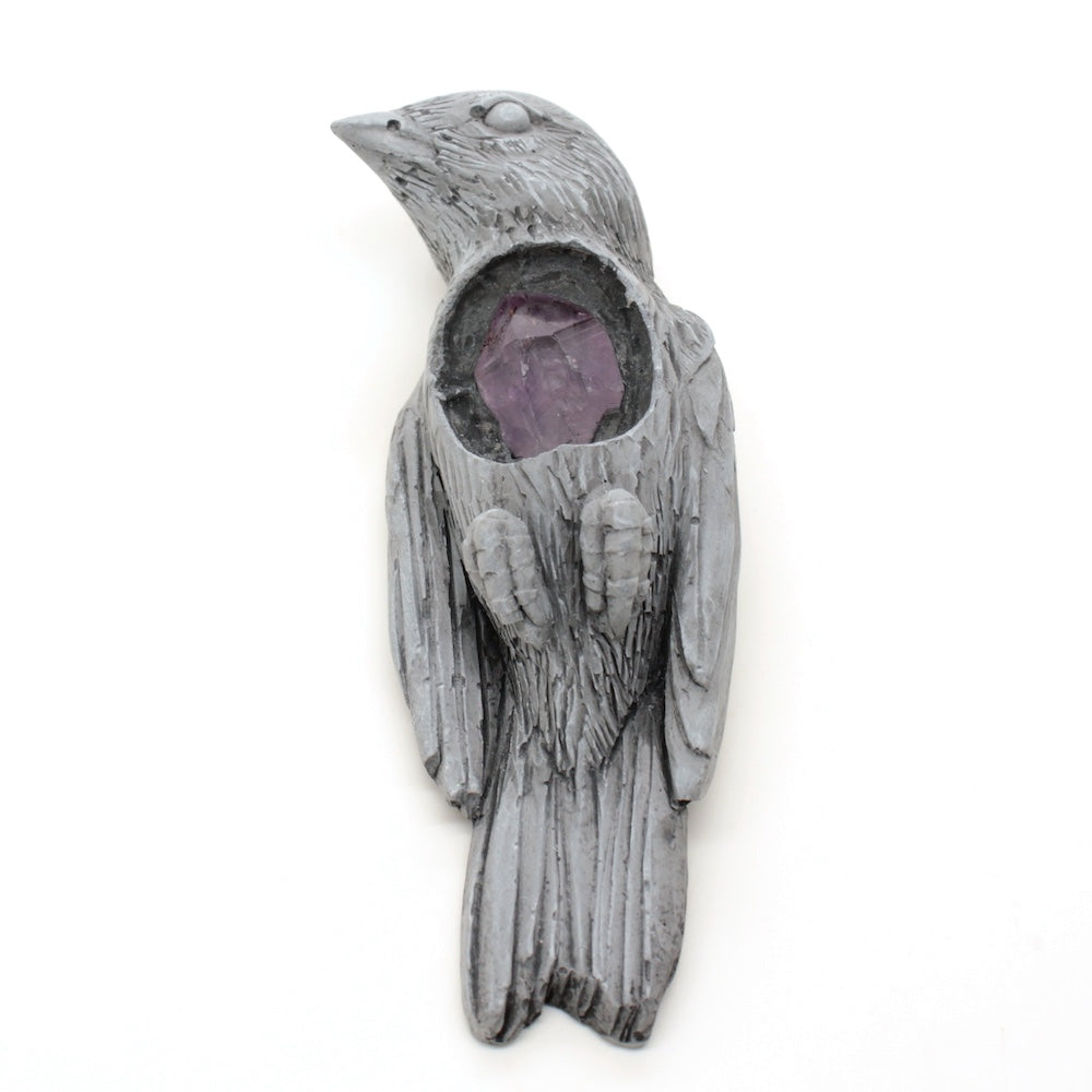 Cast gypsum plaster with an amethyst embedded inside.