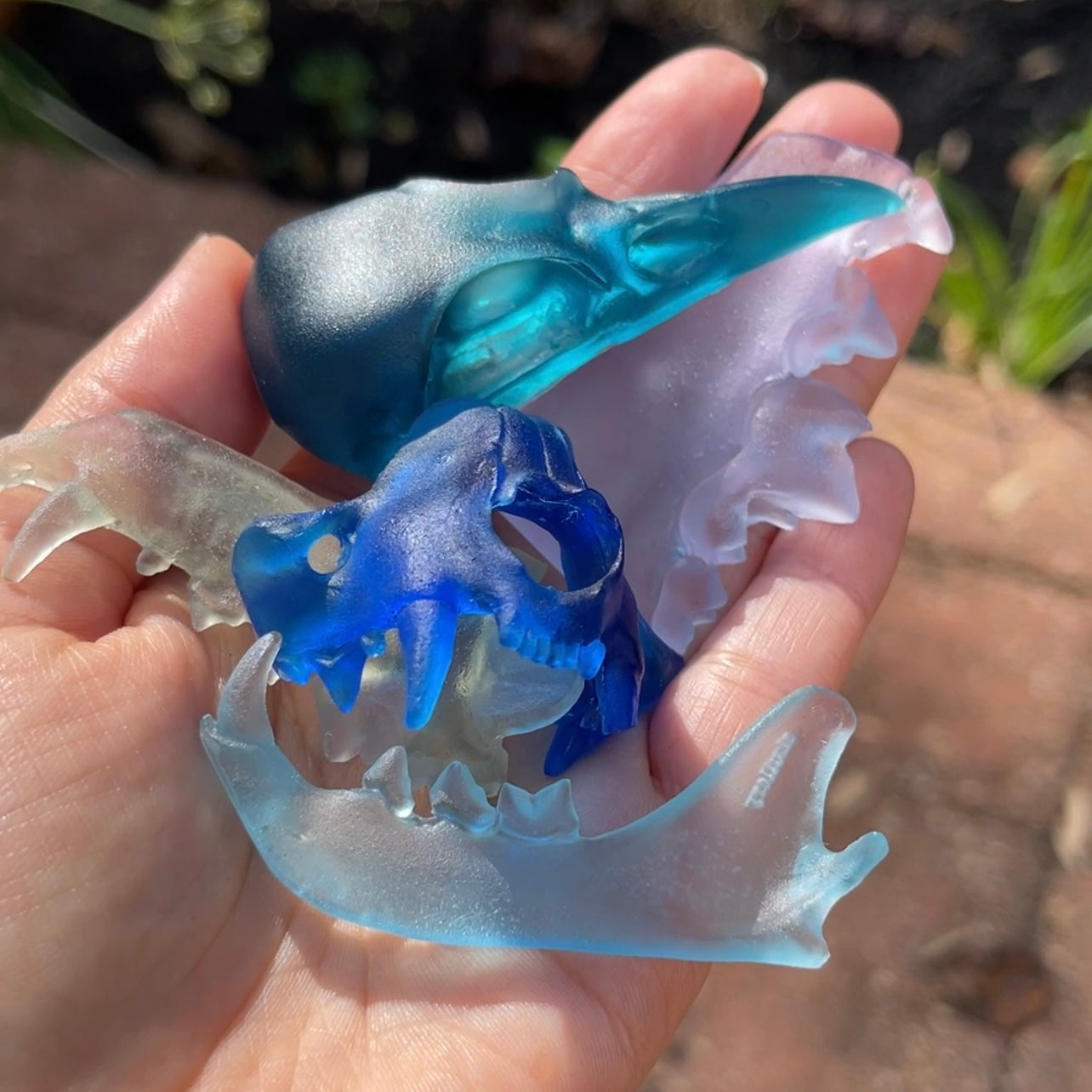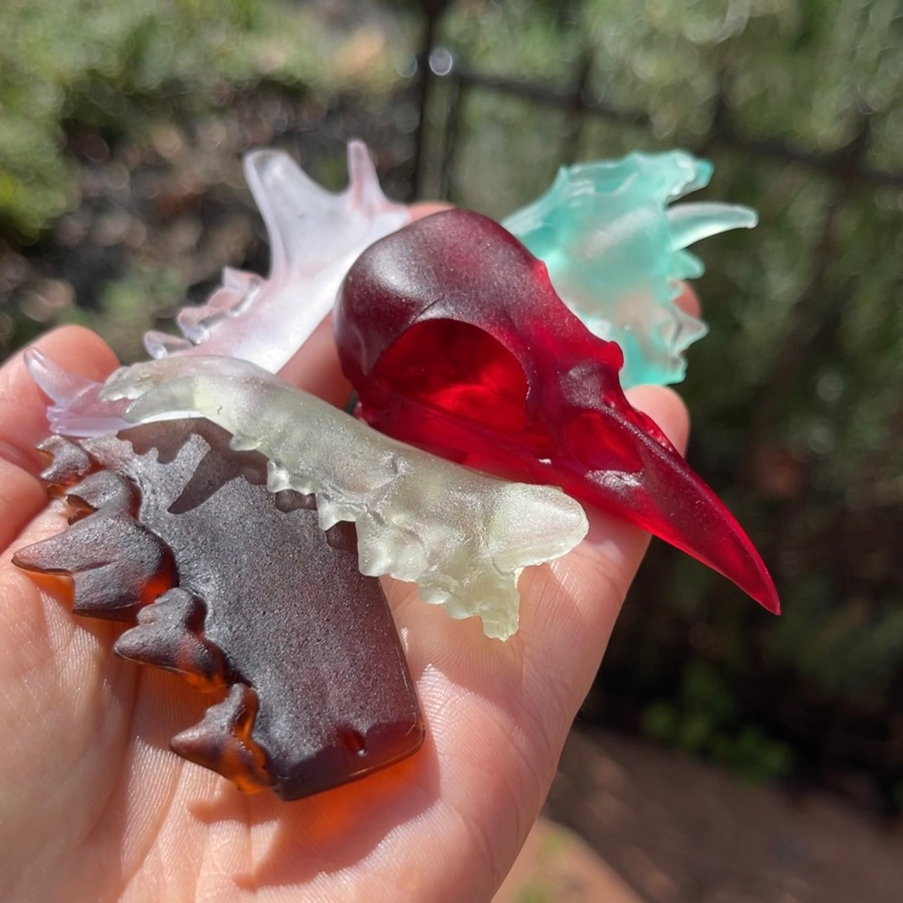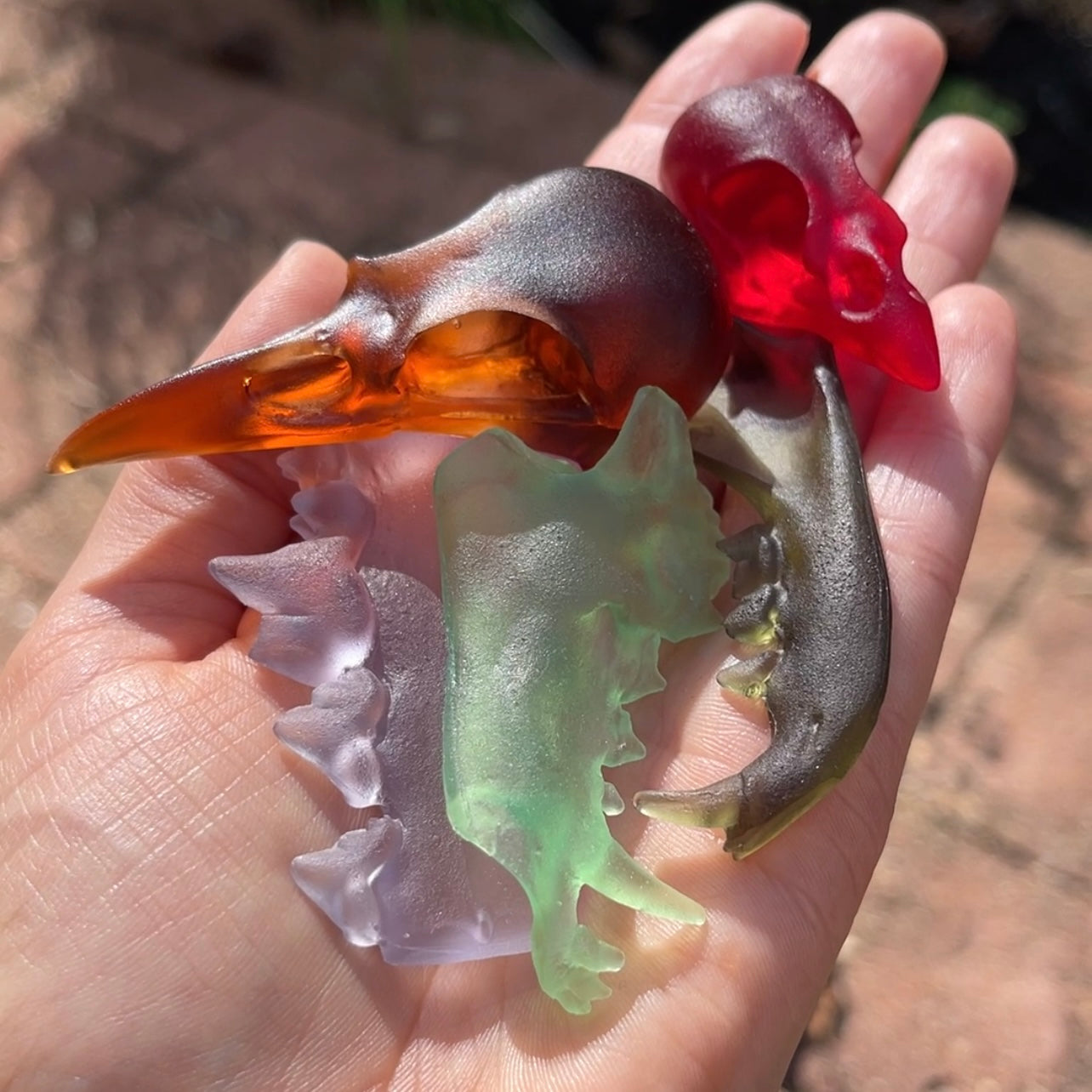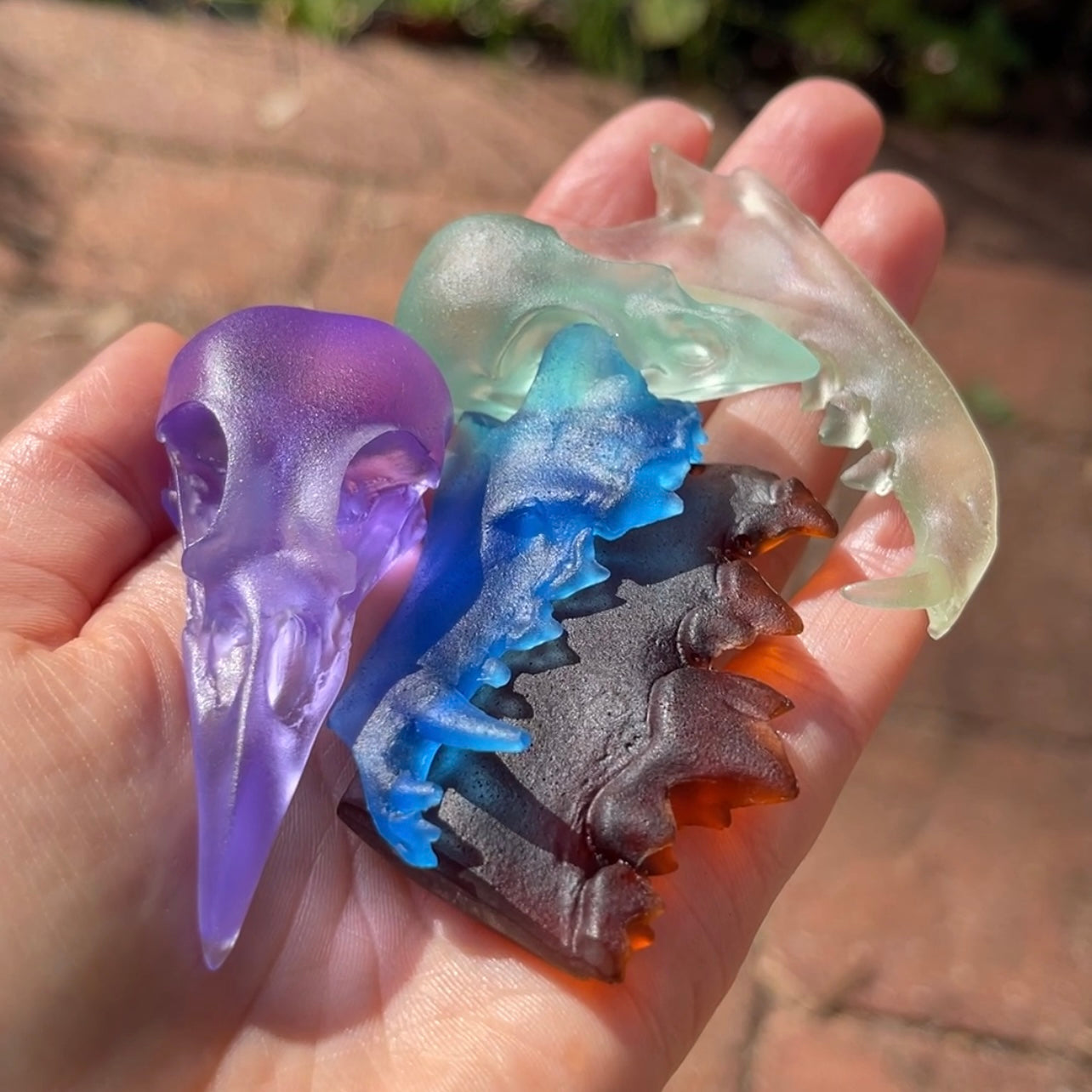 The seaglass collection consists of skulls and fragments of skulls that I gave a seaglass-like texture to, then cast in translucent colors of urethane resin like you might find on the beach (including black for pirate glass).